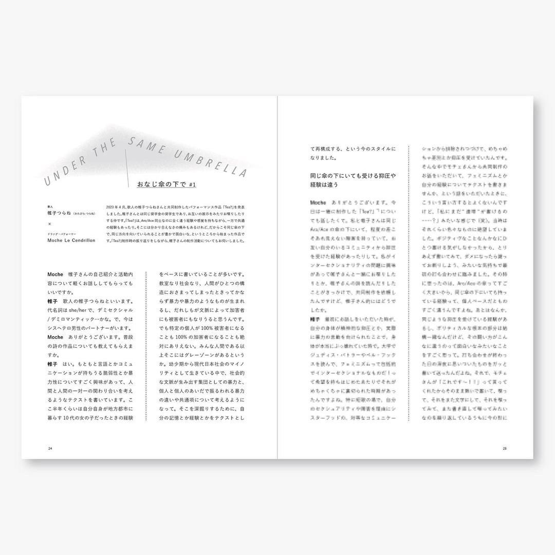 「他者に性的/恋愛的な惹かれを感じない」アロマンティック/アセクシャル(Aro/Ace)で、あらゆる差別に反対するフェミニストで、ADHDで、ドラァグ・パフォーマーの「Moche Le Cendrillon」による初めてのZINE。 間違った偏見を持たれたり、情報にアクセスしにくかったり、クィアコミュニティの中でも透明化されたりしやすいAro/Aceの、多様で複雑な経験について語り、書き残し、"あなた"とシェアするために制作されました。 Aro/Aceのオンラインコミュニティで用いられる象徴の一つに「ケーキ」があり、「セックスよりもケーキが好き」といった冗談に由来しています。まとまらないエッセイやもたついた対談、極私的で個人的な私の経験という名の「ケーキ」を、お茶を飲みながら他愛もないお話をするように楽しんでいただけたら嬉しいです。