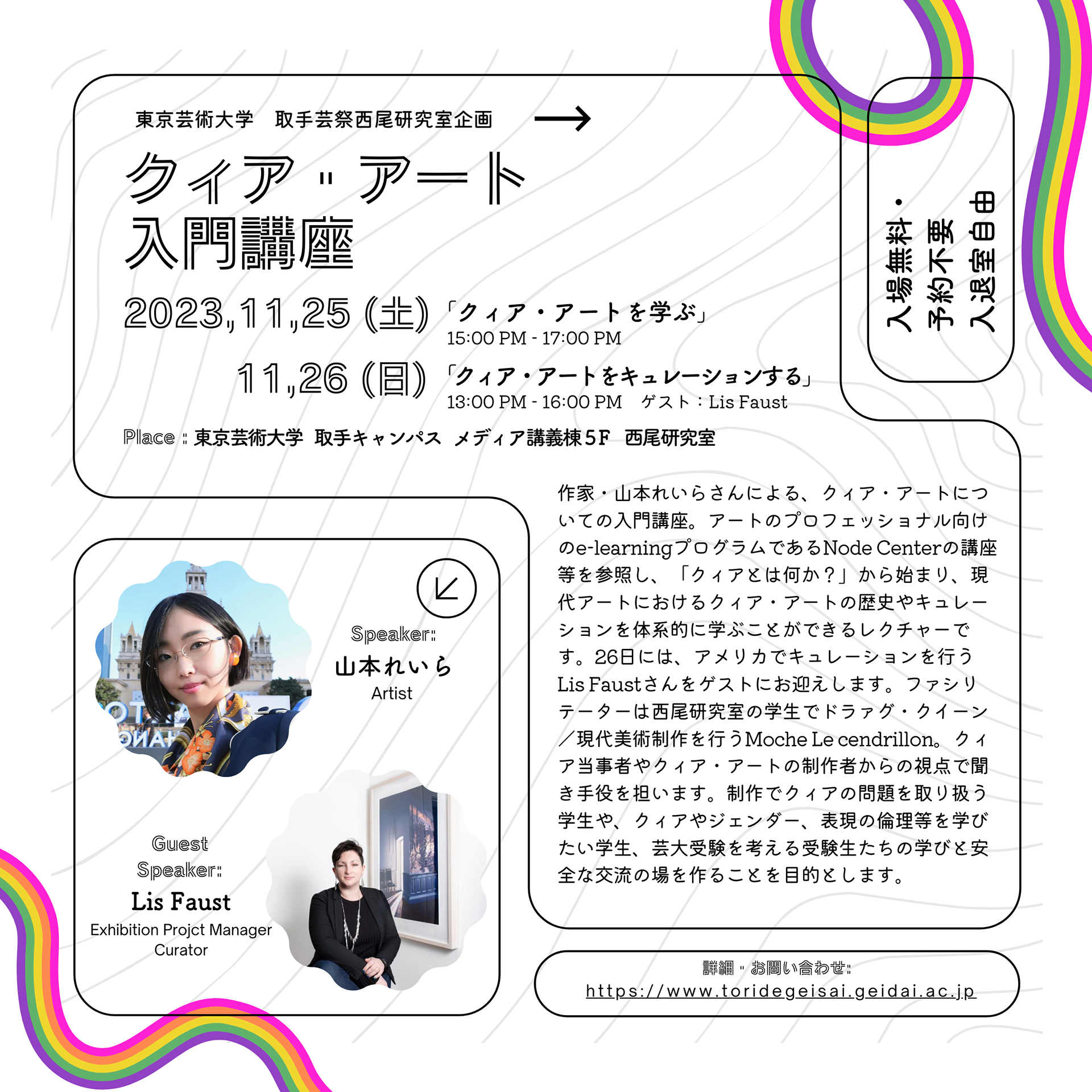 東京藝術大学取手芸祭西尾研究室企画として、講師に作家の山本れいらさん、キュレーター/エデュケーターのLiz Faustさんをお迎えし、アーティストやキュレーターを目指す学生のためのクィア・アートについての入門講座を企画・開催しました。